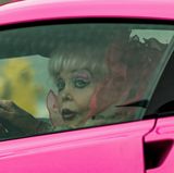 Ikona 80. let, kterou známe především díky obřím růžovým billboardům, se opět proháněla po městě ve svém legendárním Chevroletu Corvette - jak jinak, než růžovém. Dlouhé platinově blond vlasy, silný make-up, mini, podpatky a šátek přes obličej, to vše jsme již u ní viděli mnohokrát a ani tentokrát nezklamala. Dá se přitom očekávat, že Angelyne zůstane věrná svému stylu až do smrti.