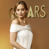 Jennifer svůj look doladila do posledního detailu. Diamantové náušnice, elegantní lodičky a červená pedikúra měly zafungovat jako kontrast k jemnému světlému hedvábí. Blond vlasy zastrčené za uši nechaly vyniknout šperkům i jejímu typickému minimalistickému make-upu. Herečka poslední dobou otevřeně mluví o kosmetických zákrocích, které by si po donošení druhého potomka chtěla konečně dopřát. V minulosti přiznala botox do čela, do budoucna nevyloučila zájem o facelift a nová prsa po ukončení kojení.