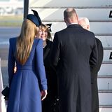 Na letiště Kate zvolila elegantní kabát v odstínu královské modré a výrazný klobouček. Později vzali s Williamem prezidenta Franka-Waltera Steinmeiera a jeho ženu Elke Buedenbender na prohlídku výstavy Královské kolekce na hradě Windsor, kde nechyběl ani král Karel III. s manželkou královnou Camillou.