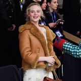 Elle si pro příležitost, kdy usedla jako divačka do přední řady přehlídky, vybrala jeden ze svých oblíbených modelů této značky: romantické ledově bílé šaty s průhlednou síťovinou vyšívanou malými obláčky a zlatými hvězdami. Klidnou energii svých šatů podtrhla kombinací s hřejivými základními kousky. Na sobě měla chlupatou koženou bundu podšitou umělou kožešinou v karamelově zlaté barvě a masivní zateplenou bílou obuv.
