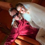 Dvojice se rozhodla pro netradiční zimní svatbu. Jak můžete vidět na snímcích, měli i netradiční modely, na které si oba potrpí. Nevěsta sice nasadila závoj, k němu ale neměla bílé šaty, ale zlaté kalhoty s flitry. Ženich zase místo obleku oblékl bordó košili.