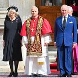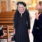 Ve Vatikánu nechyběla ani královna choť Camilla. A stejně jako královna Alžběta, i Camilla byla v souladu s protokolem oděna v černé. Protože královna není katolička, nemá „il privilegio del bianco“ (privilegium bílé), které umožňuje členkám královské rodiny nosit před papežem bílou. Camilla tak zkombinovala hedvábné šaty od Fiony Clare se závojem od Philipa Treacyho. Na jejím modelu nechyběla ani brož po zesnulé panovnici Alžbětě II. ve tvaru kříže.
